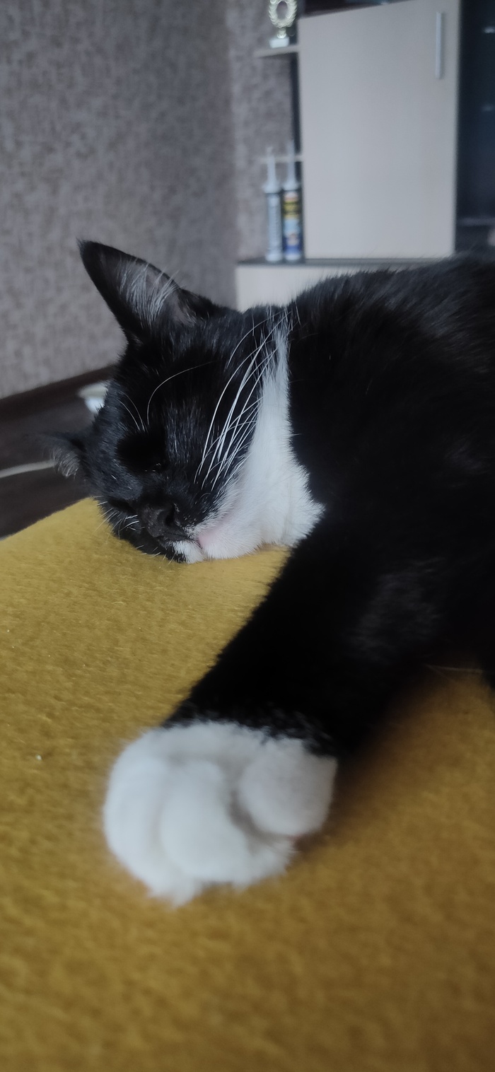 Назвали Фруша,она же Фру-фру. Сегодня это наглая мордочка прекрасно ориентируется в квартире, чиллит на подоконниках, гоняет старшую кошку Симу(тоже дворянку ),ластится как только представляется возможность и ловит мелких летающих насекомых. От прошлой жизни остался только жгучий голод, поэтому хомячит это создание и мясо, и хлеб, и картошку. Если у кого-то будут вопросы по содержанию кошек с особенностями-буду рада ответить