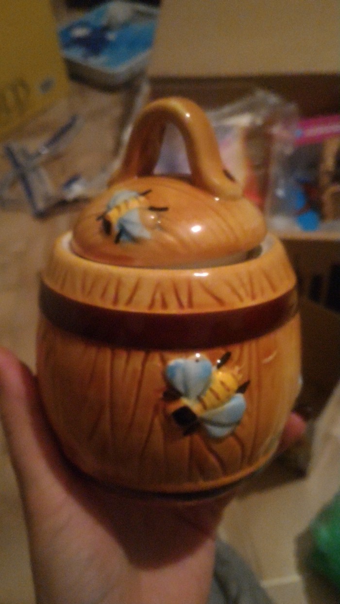 Потом я достала эту чудесную баночку для меда (осталось его купить, но мед мы любим, поэтому баночка пустовать не будет).