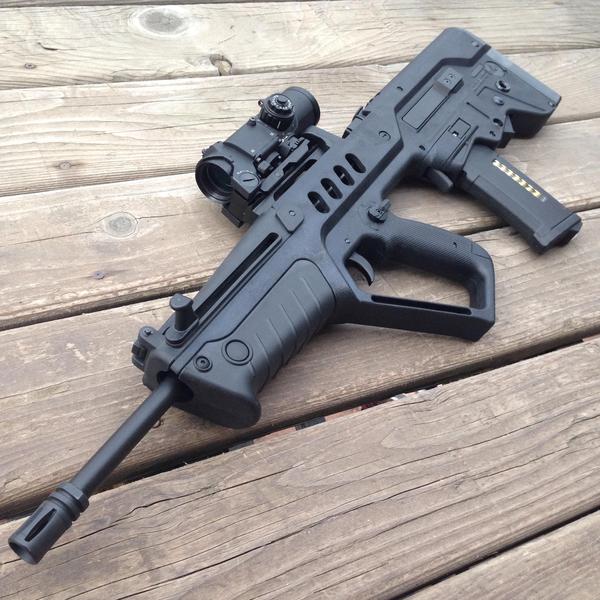 Принцип работы: отвод пороховых газов, запирание поворотом затвора на два боевых упора
