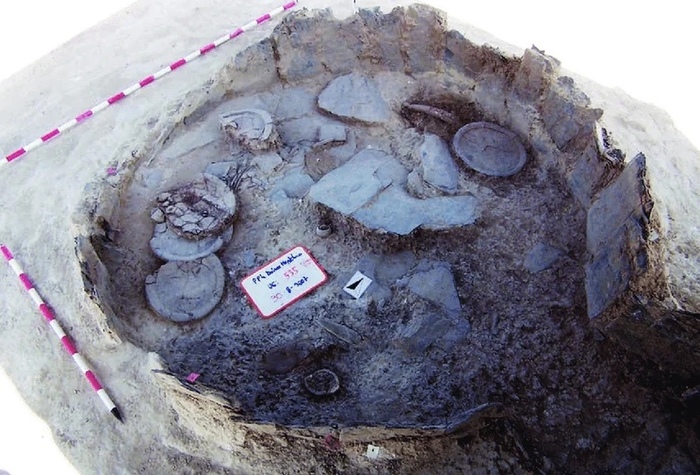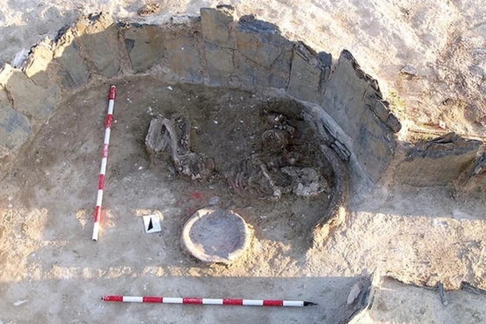 К радости археологов она оказалась нетронутой и сохранилась относительно хорошо. Удивительно то, что в этой камере обнаружили… два уровня, разделенных каменными сланцевыми плитами уложенными горизонтально. На нижнем уровне находилось захоронение молодого человека (возраст 17-25 лет) в позе зародыша с полным нетронутым погребальным инвентарем.