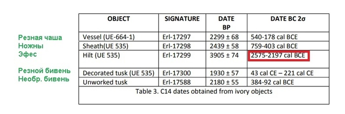 А вот два артефакта из первой камеры (с 4 скелетами) дали возраст заметно старше — в 3007-2779гг. и 2880-2629 гг до н.э., то есть от на 5-6 и, минимум, на 2 века старше первой камеры