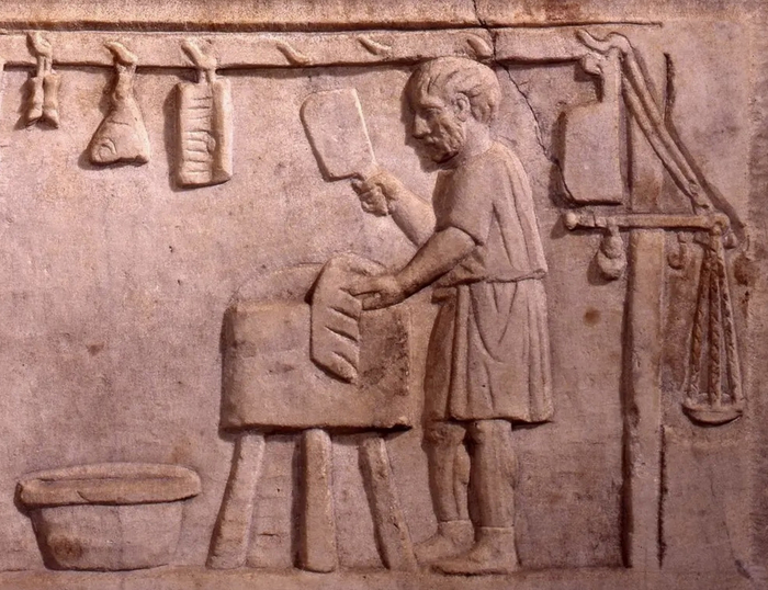 Рельеф римской гробницы показывает нам мужа и жену в за работой в мясной лавке, ок. 140-150 гг. н.э.