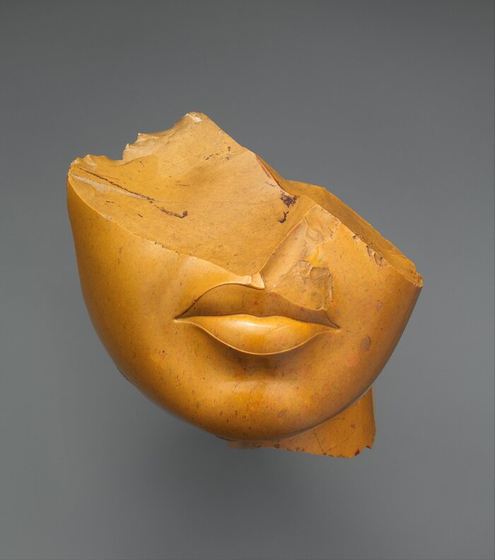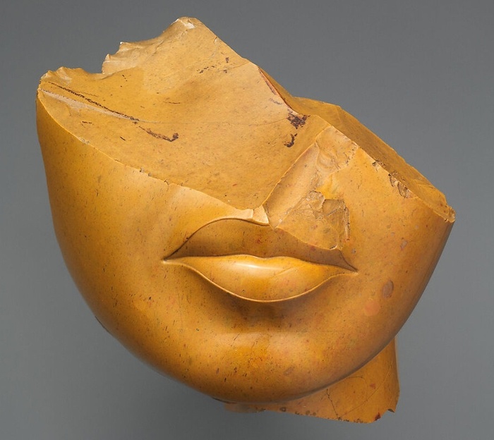 «Фрагмент лица царицы». Вечная красота из древнего Египта. Царственный портрет, искусно вырезанный мастером из желтой яшмы и отполированный до зеркального блеска почти 34 века назад. Новое царство, 18 династия, правление фараона Аменхотепа III или его сына Эхнатона, ок. 1390-1336 гг. до н.э.