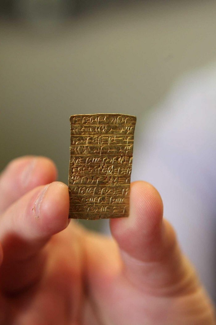Крохотный золой листок с выбитыми на ней клинописными знаками возрастом почти 3300 лет