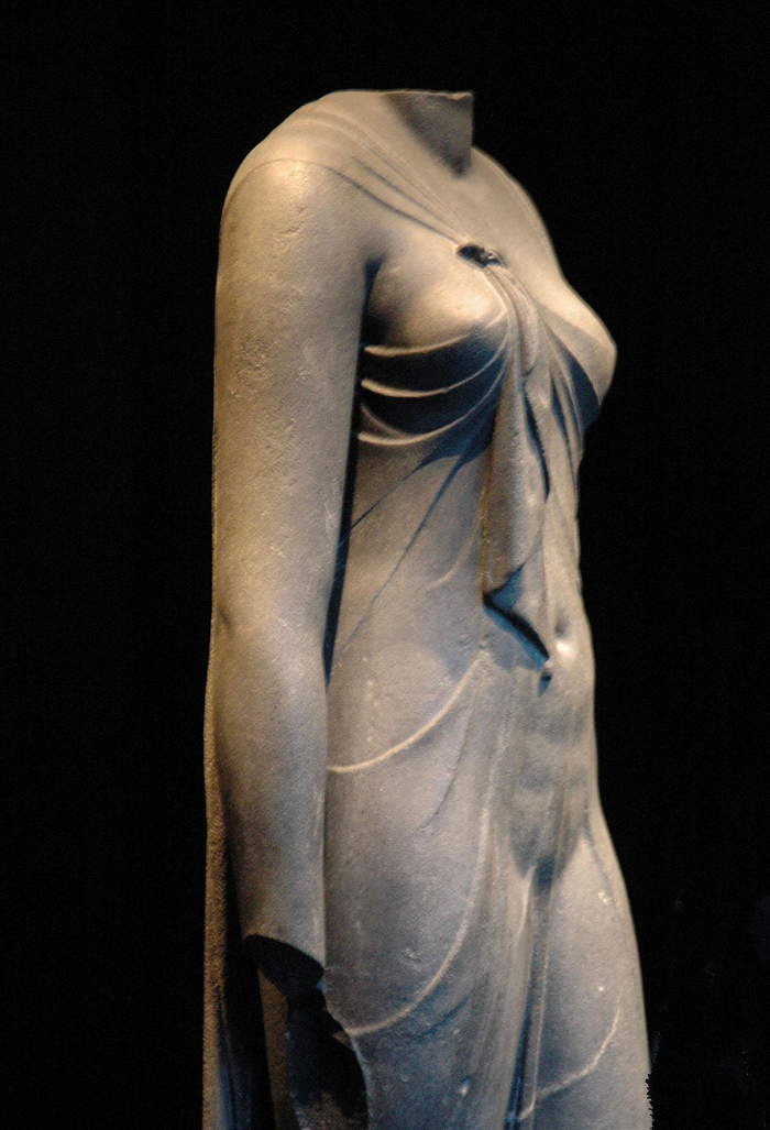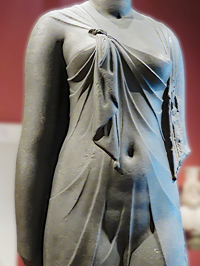 В "мокрой" одежде, которая больше акцентирует внимание на красоте тела, чем скрывает его, перед нами её величество прекрасная царица Египта Арcиноя II. Её поза характерна для египетского искусства, но сотворил это чудо, без всякого сомнения, греческий мастер.