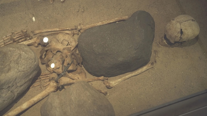 Уважаемая общиной женщина похоронена с тяжелым ритуальным копьем, причем ее опасались даже после смерти, потому тело завалили тяжелыми камнями, а рядом лежит жертва повешения, просто брошенная в могилу без всякого инвентаря.
