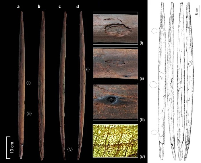 Палка из Шёнингена. Длина орудия 64,5 см. Отдельно показаны отметины от ударов (i, ii), следы удаления сучка и заглаживания поверхности (iii), превосходная сохранность клеточной структуры древесины (iv). Изображение статьи в Nature Ecology & Evolution и дополнительных материалов к ней