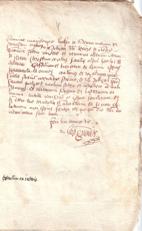 Domine magigisterque Lucifer to deum et principem agnosco, et polliceor tibi servire et obedire quandiu potero vivere. Et renuncio alterum Deum et Jesum Christum et alios sanctos alquue sanctas et Ecclesiam Apostolicam et Romanam et omnia ipsius scramenta et omnes orationes et rogationes quibus fideles possint intercedere pro me; et tibi polliceor quid faciam quotquot malum potero, et attarahere ad mala per omnes; et abrenuncio chrismam et baptismum, et omnia merita Jesu Christi et ipsius sanctorum; et si deero tuae servitui et adorationi; et si non oblationem mei ipsius fecero, ter quoque die, tibi do vitam meam sicut tuam. Feci hoc anno et die.