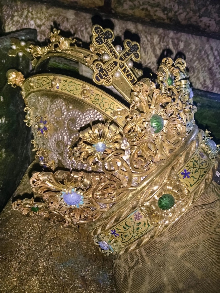 Ниже корона-митра императора, сделанная из серебра, покрытого позолотой с эмалевыми вставками. Это самая древняя сохранившаяся корона такого типа на данный момент. Орнамент и стиль работы выдает итальянских мастеров. Корона находится на закрытой тканью голове (точнее на черепе) императора.