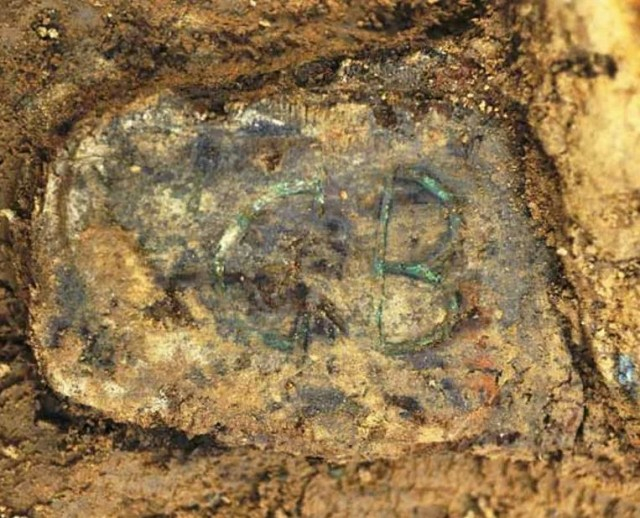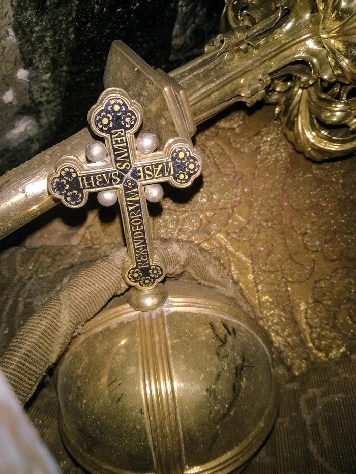 Справа виднеется, конечно же, не рука императора, а часть статуи Христа со сломанного распятия, изначально лежавшего на груди усопшего. Рядом меч с золотым эфесом и почти полностью уничтоженным коррозией клинком. В дальней части угадываются очертания черепа и короны.