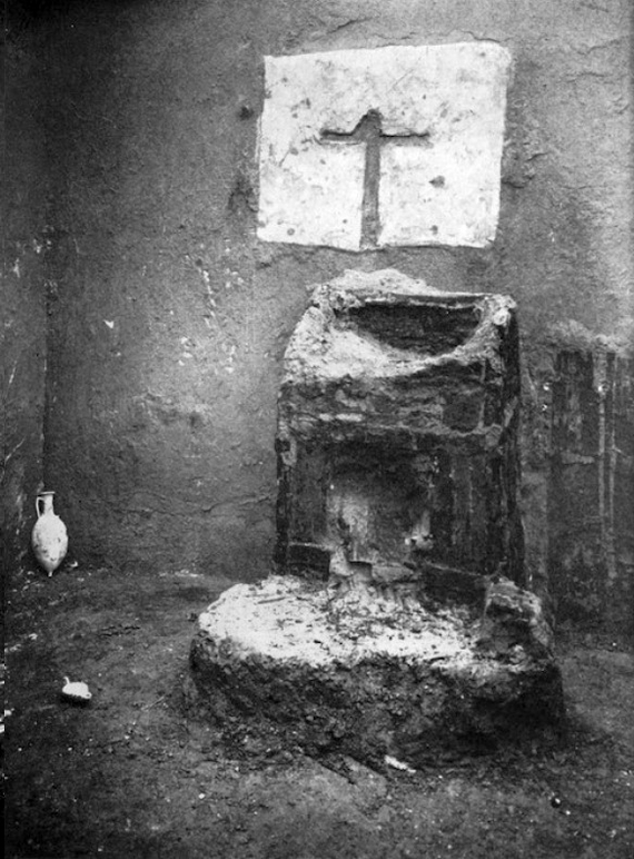 Потому когда в1938 году знаменитый археолог Амедео Маюри заявил об открытии тайной молельни христиан в Геркулануме (древнеримский город, погибший в извержении Везувия в 79 г. н.э. вместе с Помпеями), где на стене висел крест, это было как взрыв бомбы!