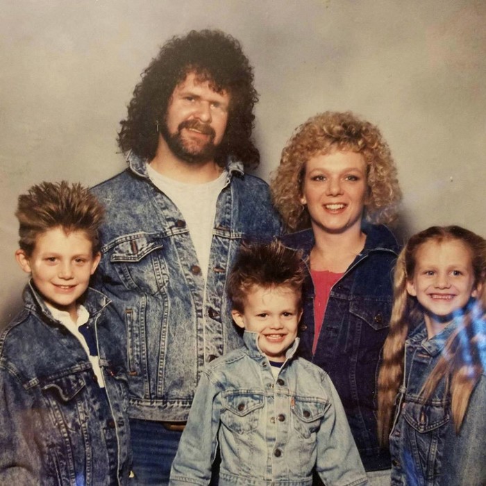 Это наша семья во времена, когда пышные длинные волосы - были лучшие волосы. Мы с мужем смело могли бы быть на бэк-вокале у группы "Poison". Я уверена, что я помогла убить озоновый слой тем количеством лака для волос, которым я пользовалась. Наш бедный сын был беспомощен перед закидонами своих родителей. Но было круто... (с)