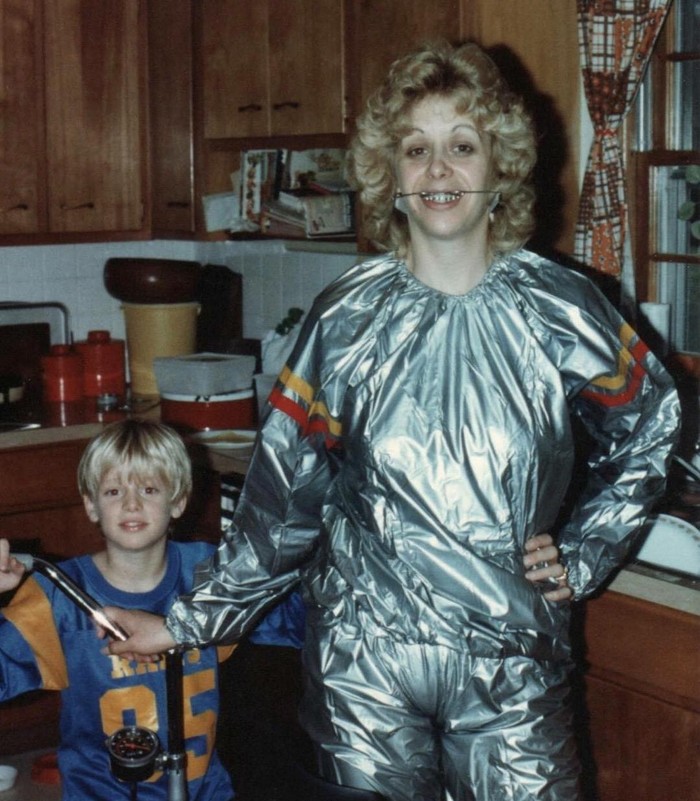 Это я и моя мама в 1979 году. Мама показывает свой велотренажер и "костюм для сжигания жира". (с)