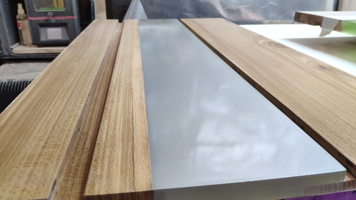 Не очень нравится как сделал сращивание двух столешек, надо было под 45 рубить их, или с помощью фрезы... Ну да что уж теперь поделаешь - опыт штука дорогая. И да, я чуть-чуть схитрил - покрыл базовый слой дополнительно акриловой краской-металликом. Перламутровый металлический пигмент при малой толщине заливки проглядывается, сколько ни вгрохай. Имей ввиду. Меньше сантима - скорее всего будет просматриваться, сделай тестовую заливку.