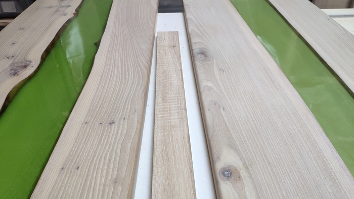 Грунтую деревяшку смолой (шоб пузыри убрать), раскладываю на столе как положено, делаю опалубку (шоб смола не утекала), и заливаю базовый слой, он же - подложка. Поскольку деревяхи будут лежать на пеноблоках, а там не оч.красиво, надо это дело скрыть. Плюс - от подложки свет будет прикольно отражаться, и смолу ещё дополнительно высветлит, получим отличный салатовый оттенок. Вкусный такой, как свежее зелёное яблоко.
