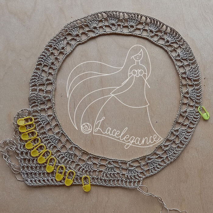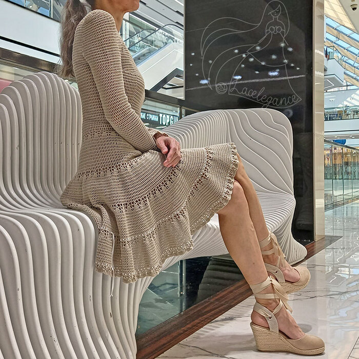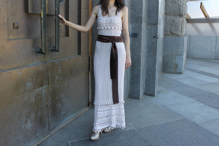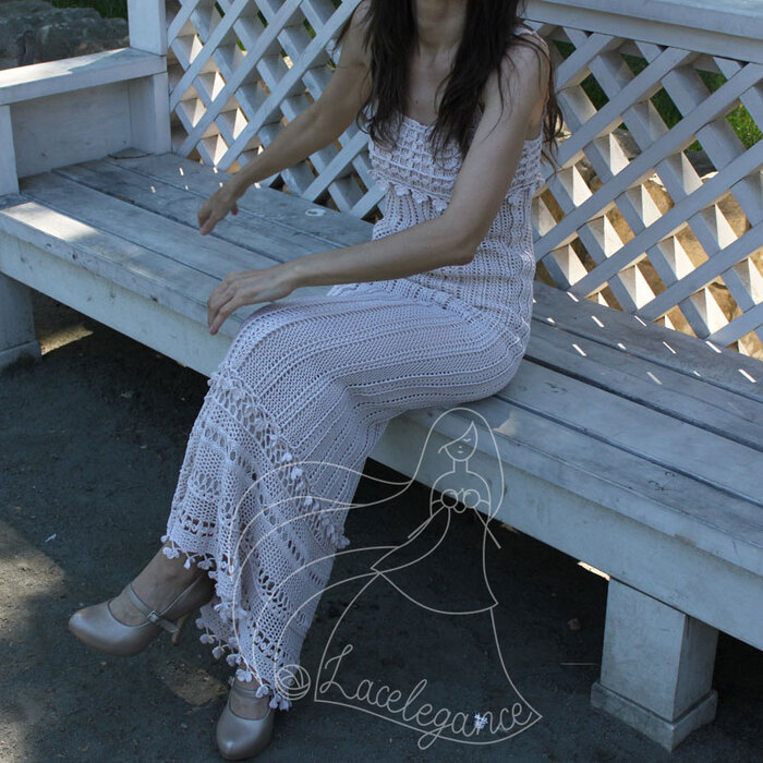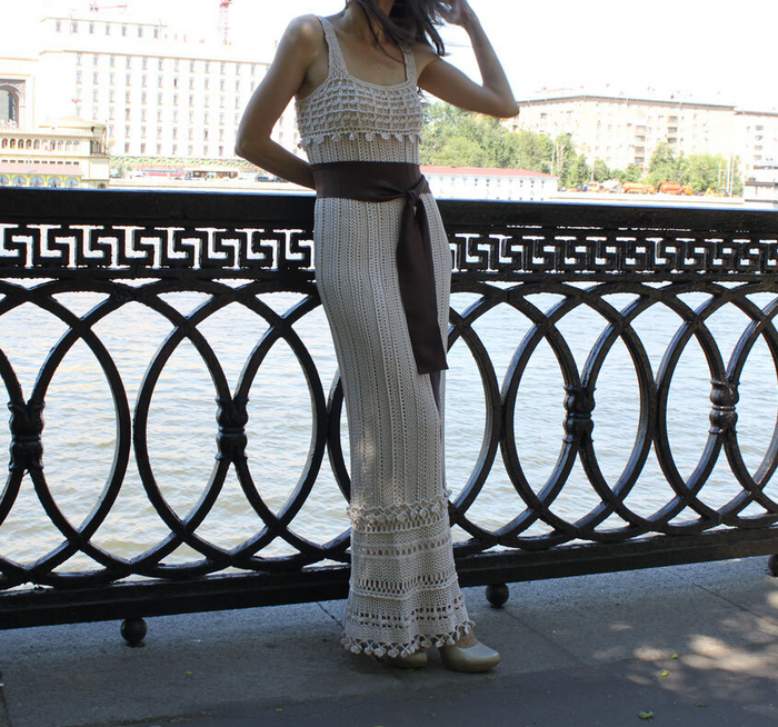 В процессе вязания выяснилось, что окружность подола для платьев в пол должна быть не менее 140см. Тут меньше, не ходишь, а семенишь как в японском кимоно. Неудобно (