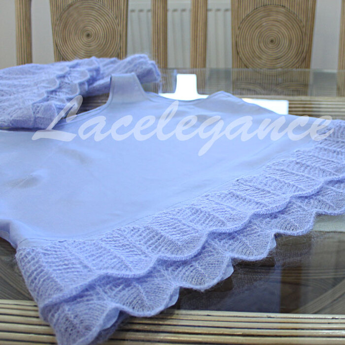 Поэтому верх распустила, горловину оформила тем же паттерном, что и на юбке, от горловины верх вязала по кругу, к готовым рукавам его присоединила в проймах, а к юбке - на талии.