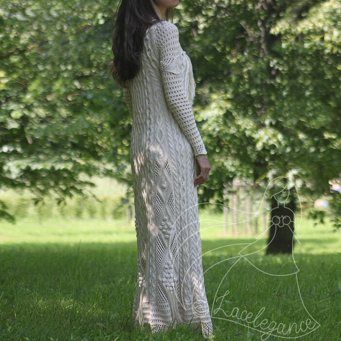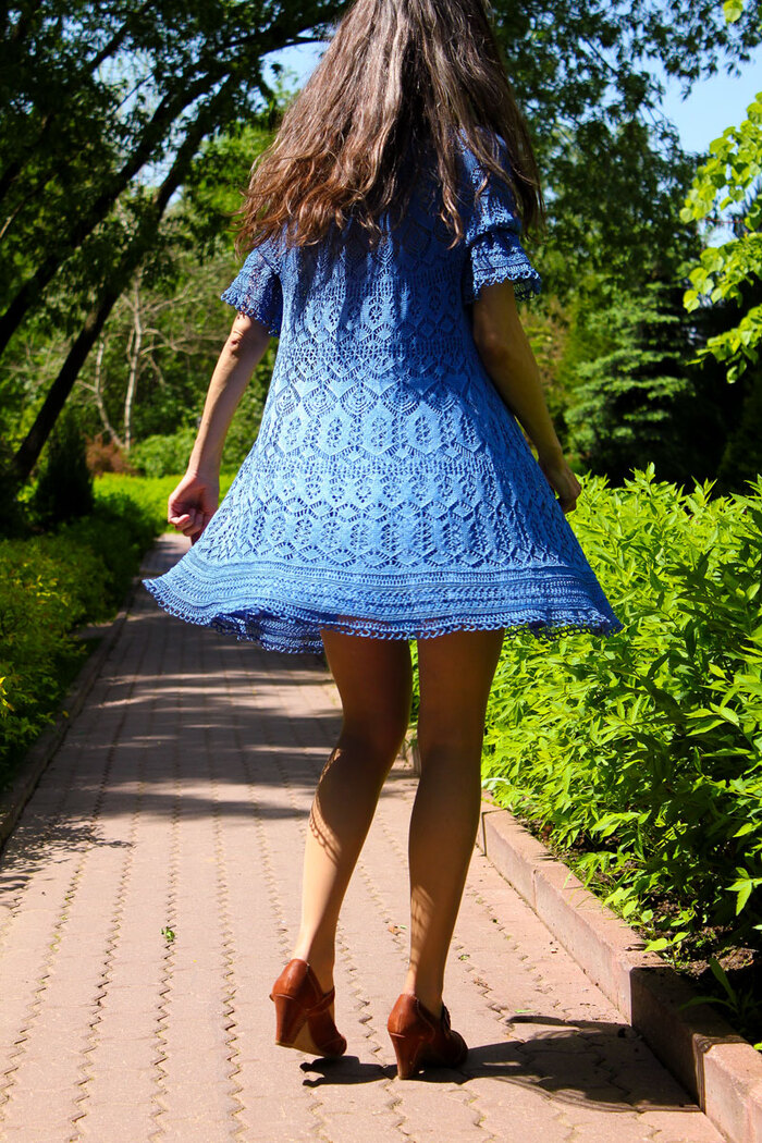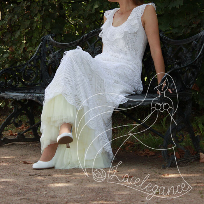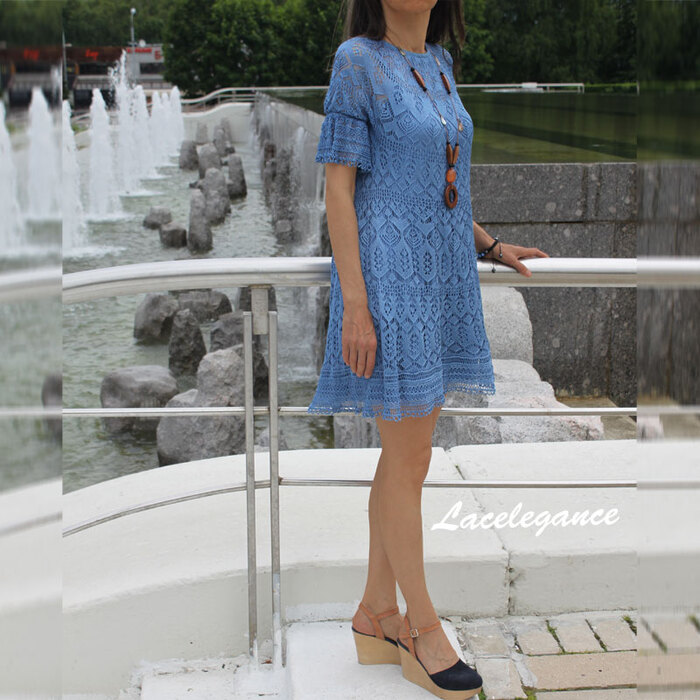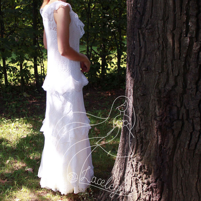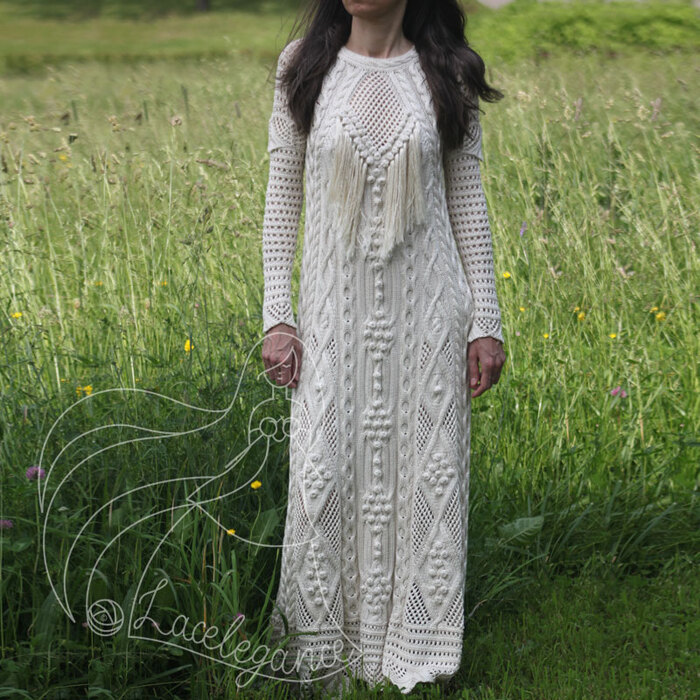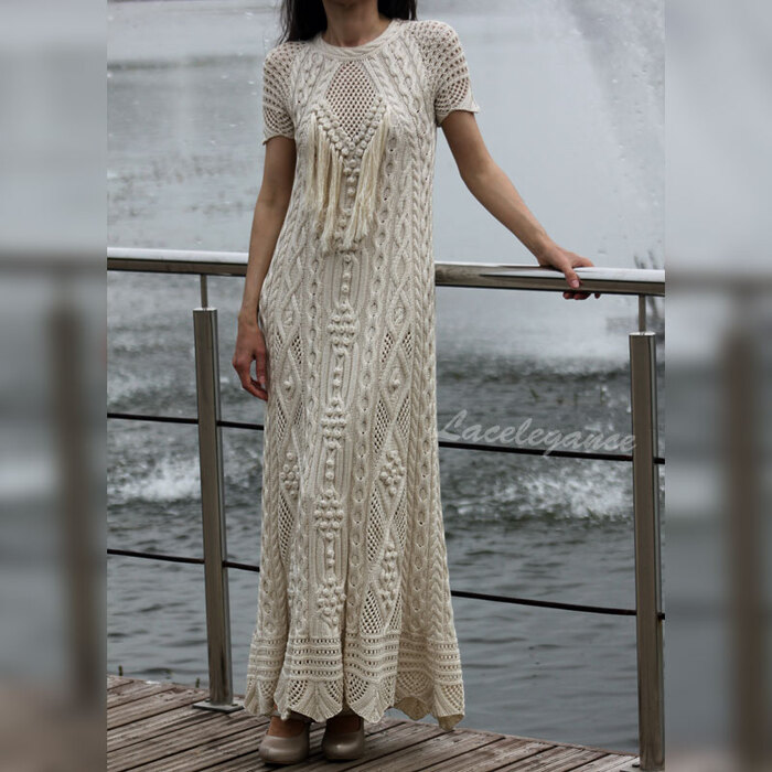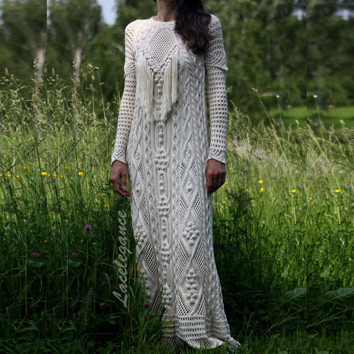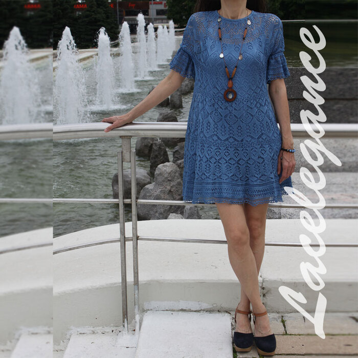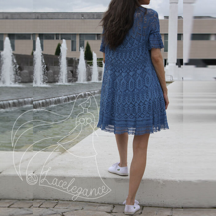 Как-то увидела в интернетах широкое тканевое платье А-силуэта с оборками и захотелось такое связать.