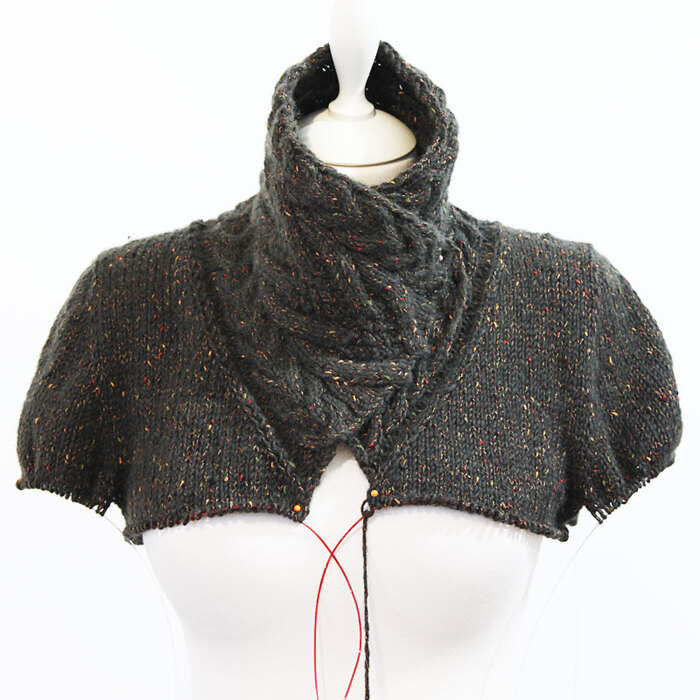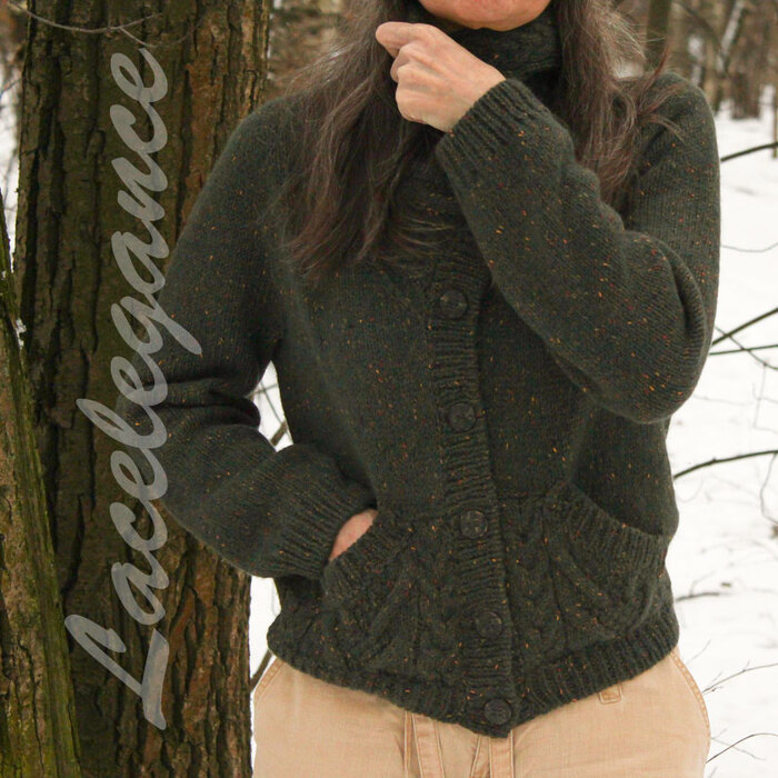 От воротника до нижней точки проймы кардиган вяжется вместе с рукавами, затем петли рукавов переснимаются на дополнительные спицы, а кардиган довязывается до низа. Плечевые скосы и карманы вяжутся укороченными рядами. Петли для планок набраны по краю переда.