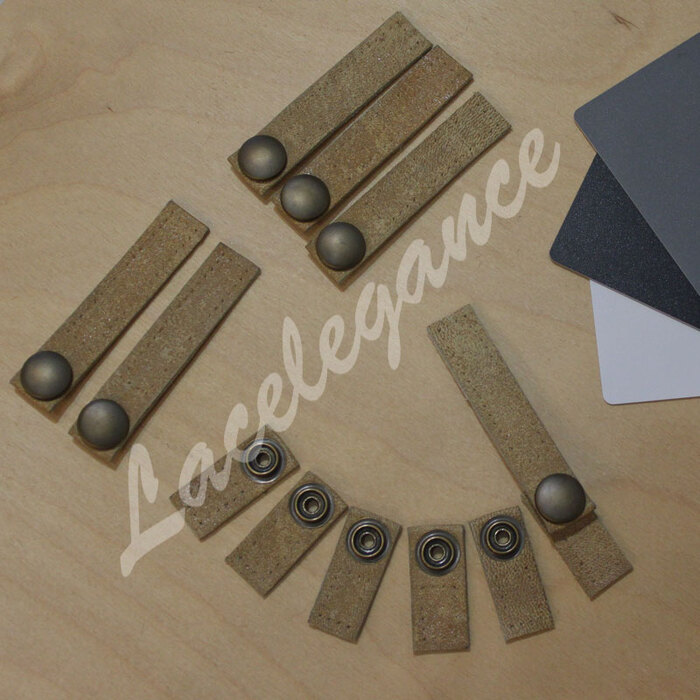 В процессе вязания родилась идея сделать кожаные застежки в цвет крапушек - настучали кнопок на полоски кожи.