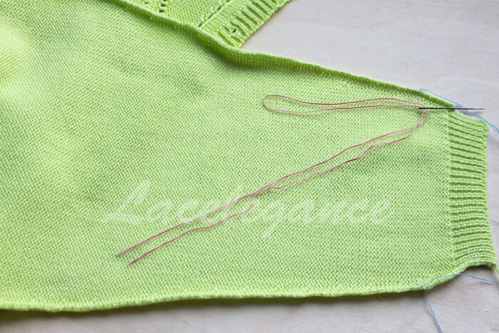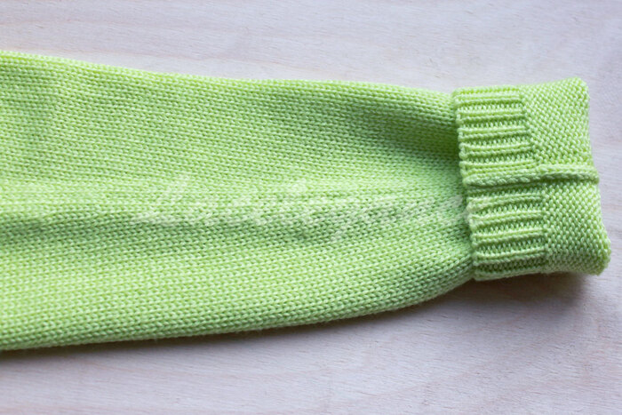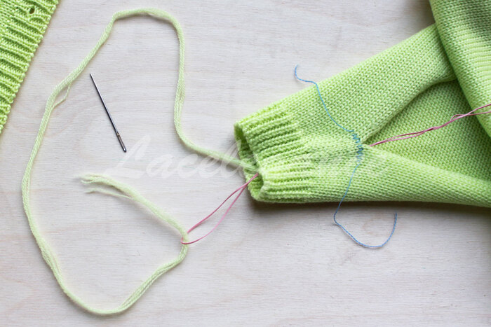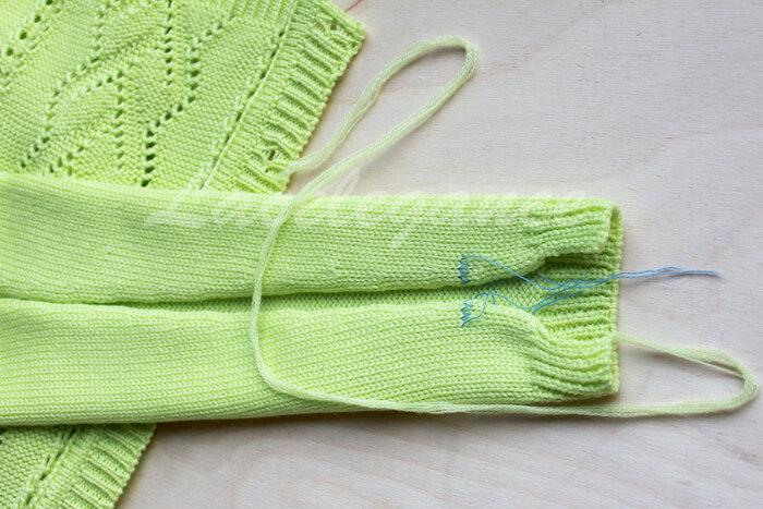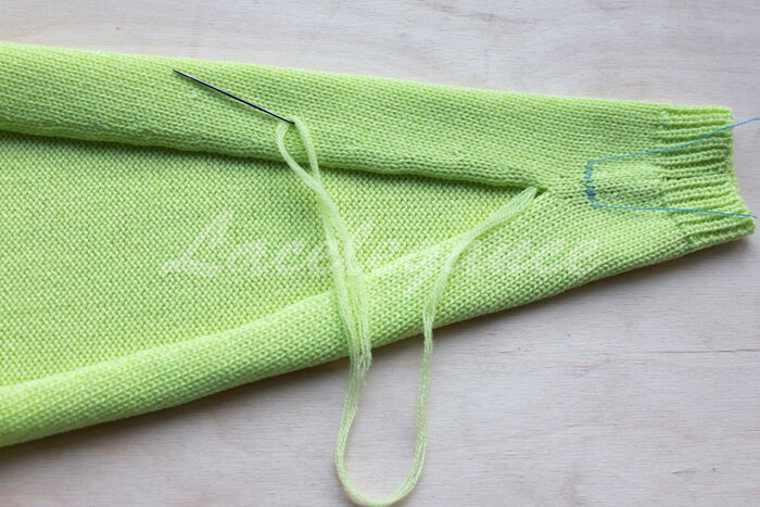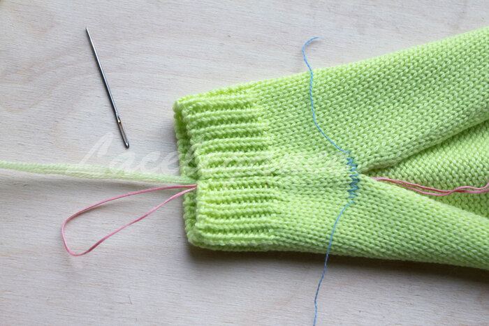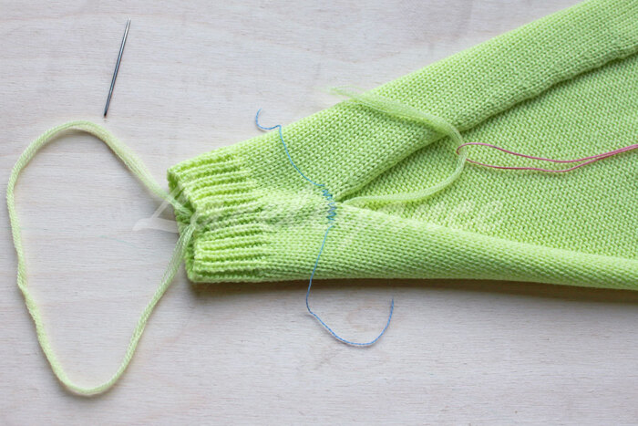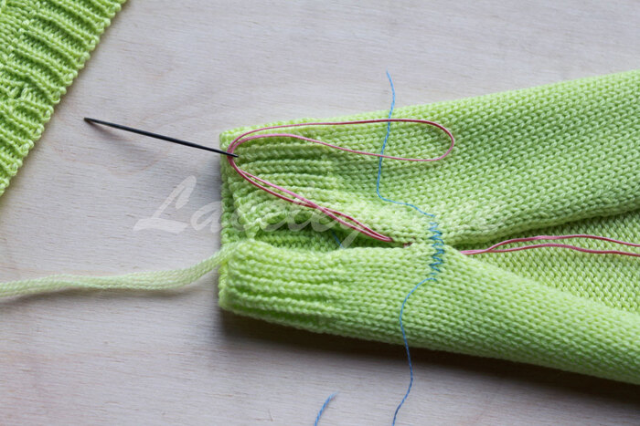 Начинаем сшивать вертикальным трикотажным швом от контрастных петель в направлении манжета (в данном примере есть четкая граница между резинкой и кулиркой, но я решила