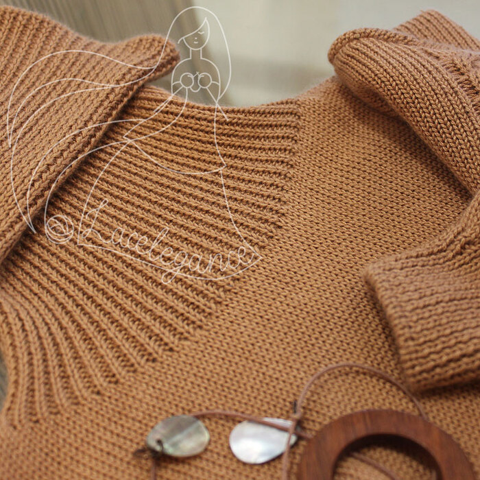 Мне очень нравится вязать горловину так, чтобы воротник не приходилось прикеттлевывать: горловина вывязывается укороченными рядами, петли выреза горловины остаются открытыми, затем эти открытые петли вяжутся резинкой.