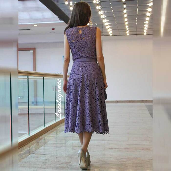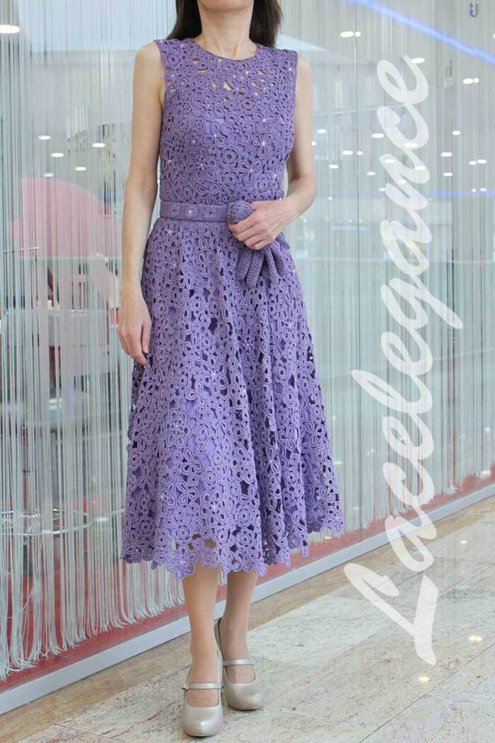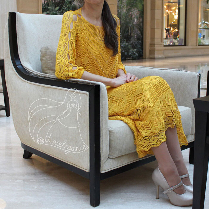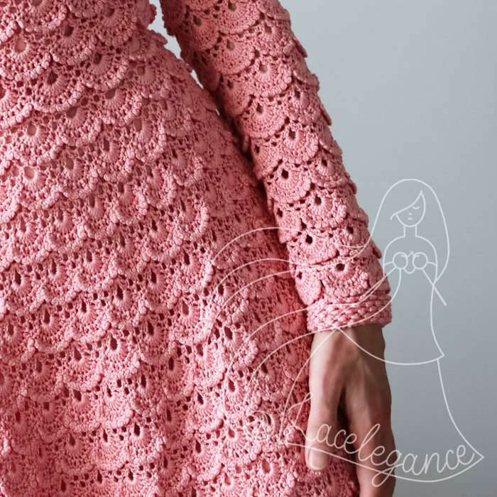 Платье связано крючком сверху вниз в технике имитации втачного рукава (рукава вяжутся вместе с верхом платья до нижней точки проймы).