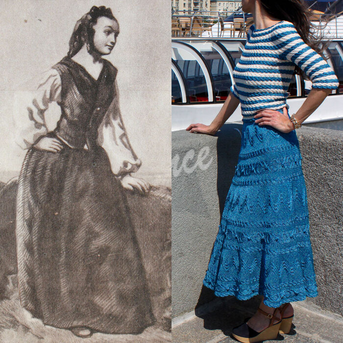 Отправным пунктом платья стала тельняшка. Но обычная тельняшка будет слишком простой, поэтому было решено обыграть в ней тему морских канатов.
