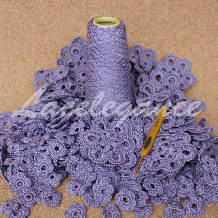 Все цветы связаны отдельно и сшиты. Порядка 1000 цветов, из них 10% больших, 20% трилистников, 23% средних и 47% мелких. Это в штуках. По весу - по 250г каждых.