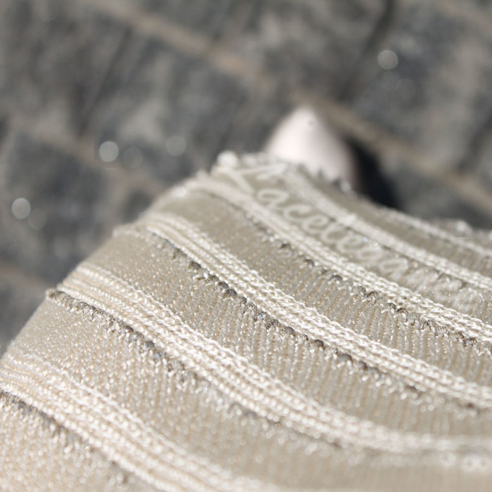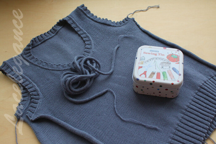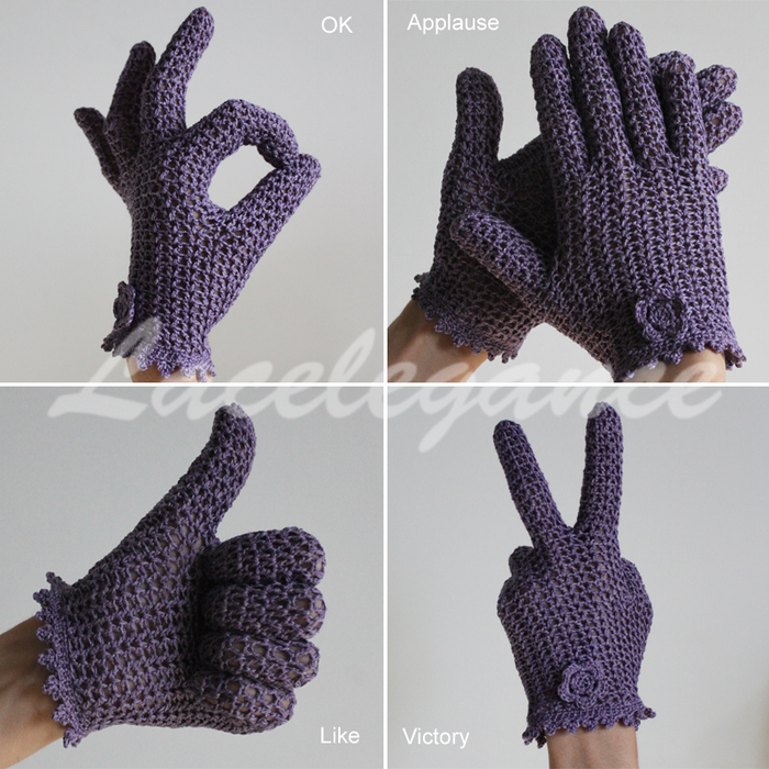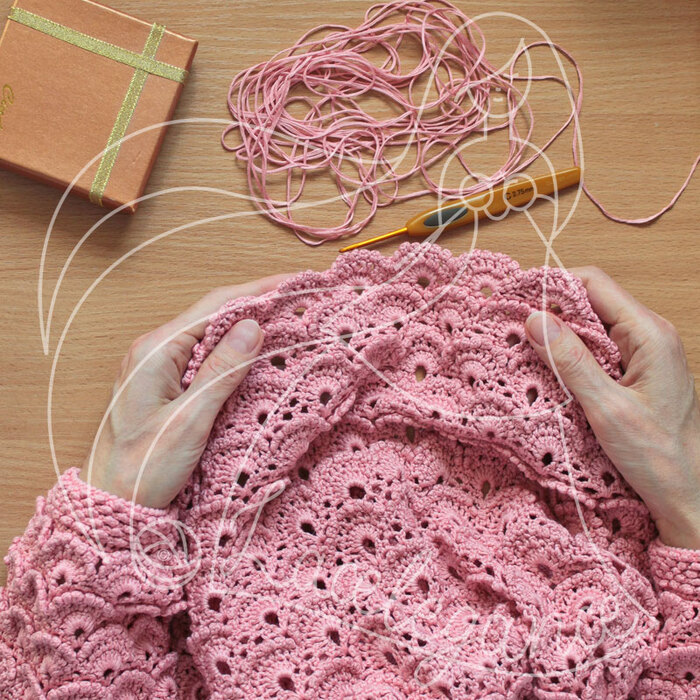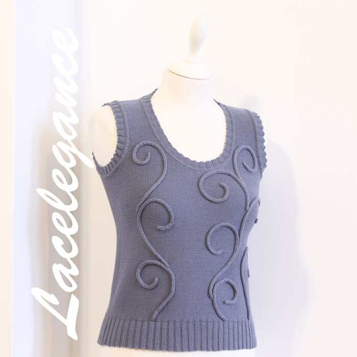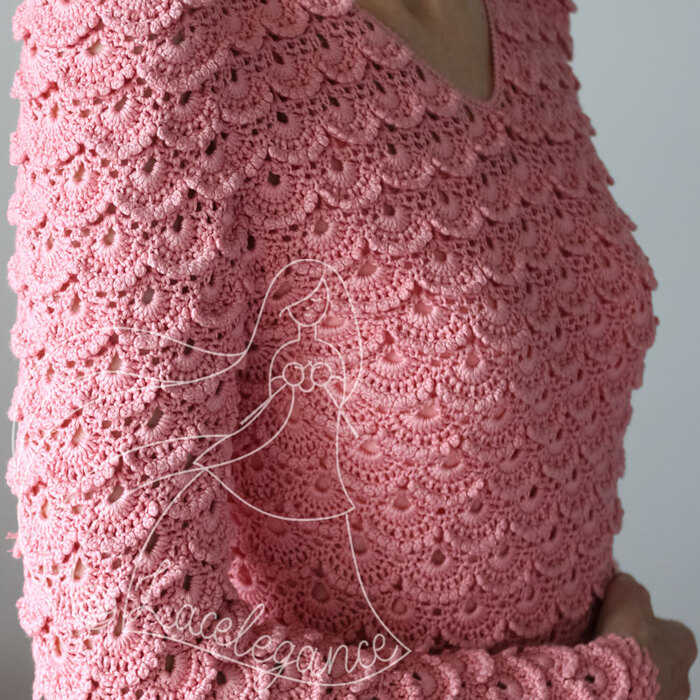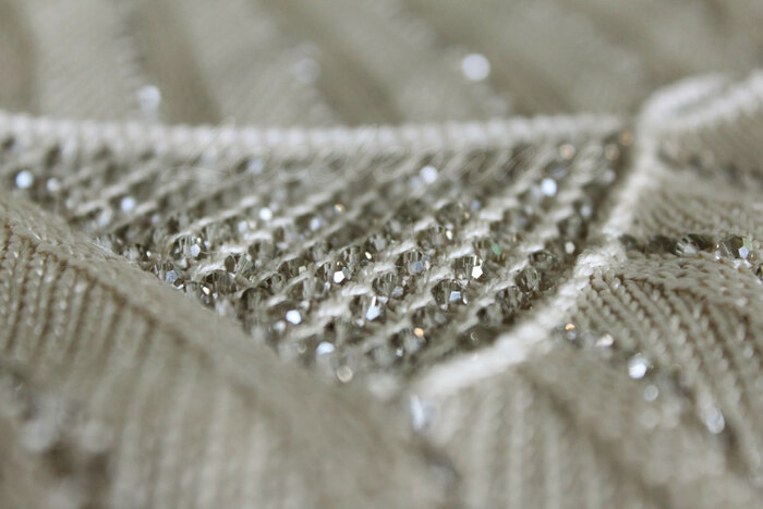 Верхний край рукавов связан в форме зигзага, задние и передние части соединены в верхних точках с использованием хрустальных бусин Сваровски диаметром 6 мм.