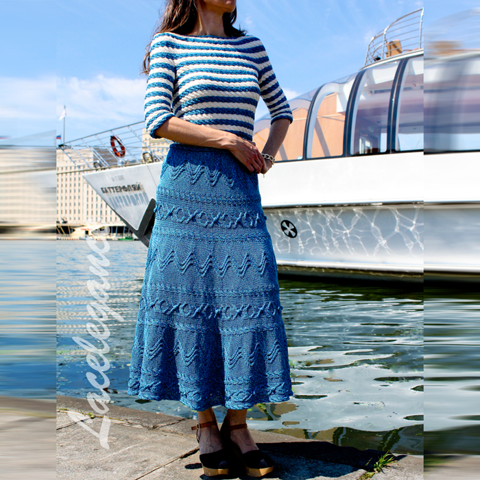 Отдельно связан i-cord и пришит произвольно по всем шести клиньям юбки.