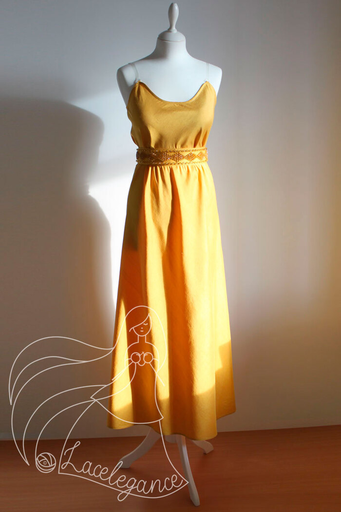 Такими же бусинами украшена передняя верхняя часть платья и пояс. Всего использовано 600 штук.