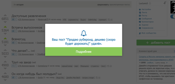 Оповещать об удалении постов/комментариев и причине этого действия.