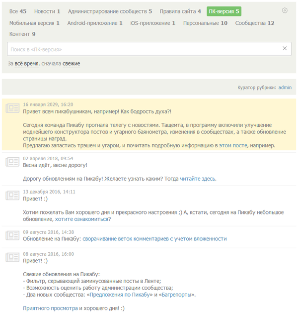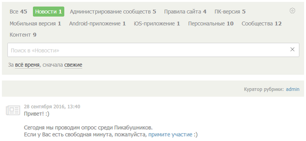 Админ не пишет об изменениях в правилах, мобильной версии, приложениях... Об этом пишут другие. Вместе с тем, это и плюс: с админа снимаются данные задачи. Но сам он вынужден разделять информацию по двум категориям «Новости» и «ПК-версия», что может оказаться не очень удобным обстоятельством.