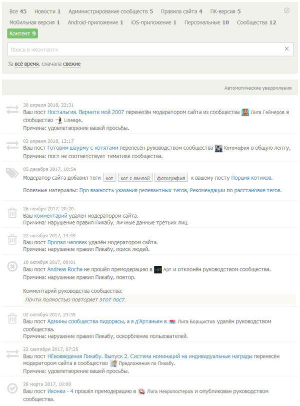 Но уведомление о бане приходит в категорию «Персональные», уведомление о бане в сообществе — «Сообщества», уведомление об удалении поста — «Контент»... Некоторых это может запутать.