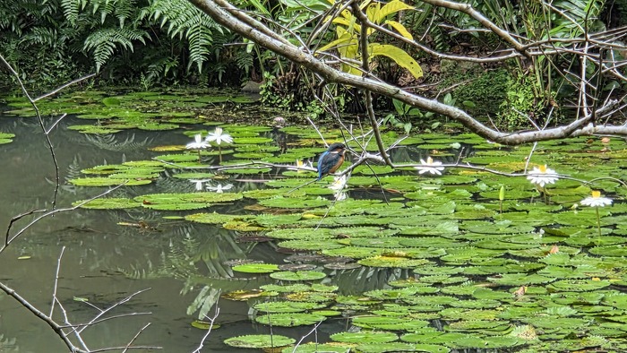В более узкой части растут водяные цветы (лотосы?). И птичку цветную удалось заснять