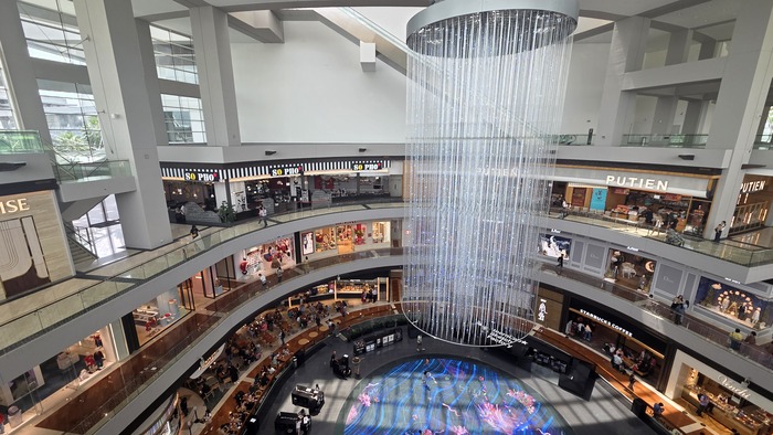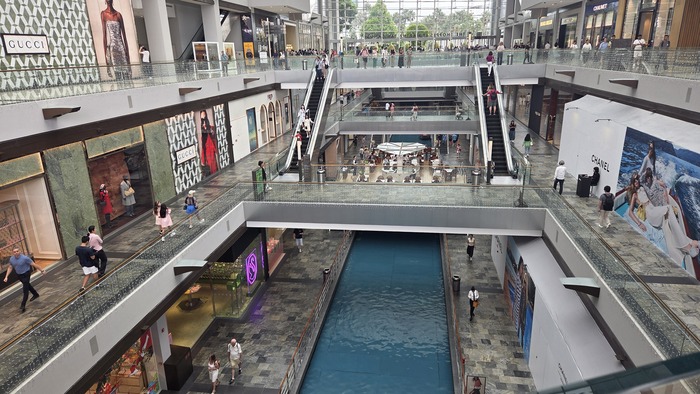 Конструкции справа - это фонтаны, с которыми как раз устраивают вечернее шоу (в 20:00). Круглый павильончик на воде слева - магазин Apple.