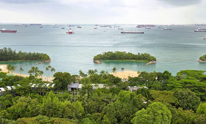 Вид на парк Gardens by the Bay и оранжереи Flower Dome и Cloud Forest со смотровой площадки (заодно можете оценить морской трафик - пожалуй, в Босфоре столько нет)