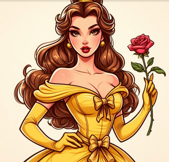 Любовь Белль к знаниям и её глубокая душевность остаются неизменными, но пин-ап версия добавляет её образу утончённости. Винтажные платья, изящные причёски и акцент на её интеллигентности делают её ещё более харизматичной.
