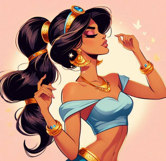 Принцесса Жасмин, стремящаяся к свободе, идеально вписывается в пин-ап эстетику. Её сильный и страстный характер раскрывается через грациозные позы и элементы восточной экзотики, при этом образ сохраняет мягкость и женственность.