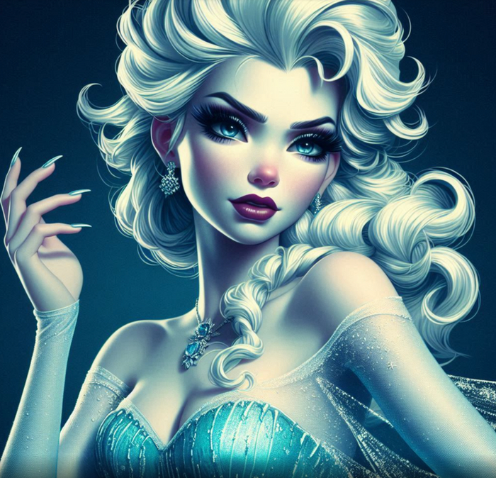 Её королевская сила и магия льда в пин-ап интерпретации становятся ещё более эффектными. Холодные оттенки и элегантные наряды подчеркивают её величественность, а образы приобретают гламурные детали, раскрывающие её уверенность.
