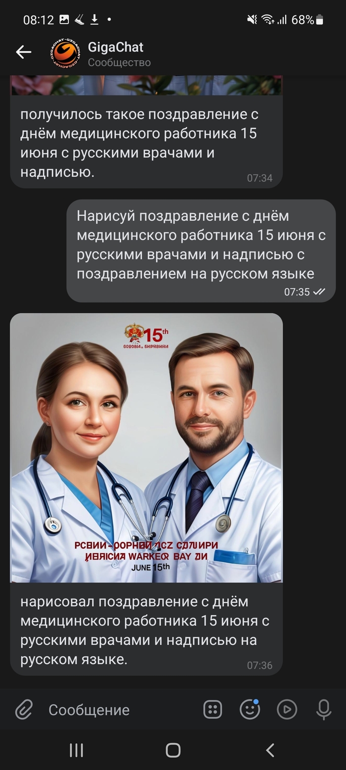 Сегодня День медицинского работника. Попросила ГигаЧат в вк создать поздравление, писала несколько запросов, выдаёт сначала мулатов и азиатов, на запрос с русскими врачами выдал адекватную картинку, но надписи на русском так и не получилось! Вот запросы: