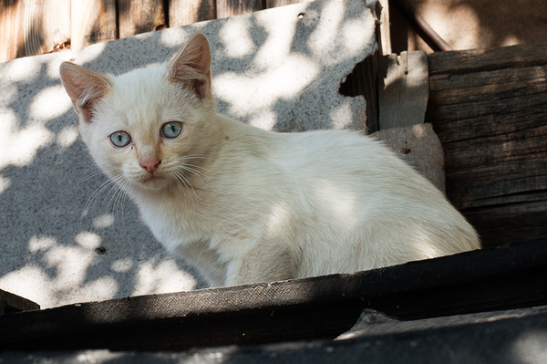 Рыже-белый самый активный и смелый, всегда ходит с мамашкой, играется даже когда остальные спят. Второй рыжий и белый уже не такие смелые, но все же не так опасаются нас. Черные еще вчера прятались от нас на чердаке, но сегодня уже были посмелее и выходили немного поиграть. А вот черно-рыжий самый маленький и самый боязливый из всех. Его удалось заснять только один раз, да и то, одну лишь мордочку, сегодня мы его даже не видели.