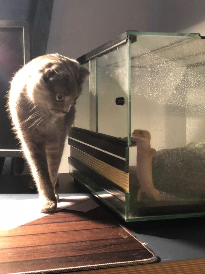 Фото первого дня с ещё немытом террариумом и в тёмной комнате. Кошка с тех пор старается не замечать нового жильца.