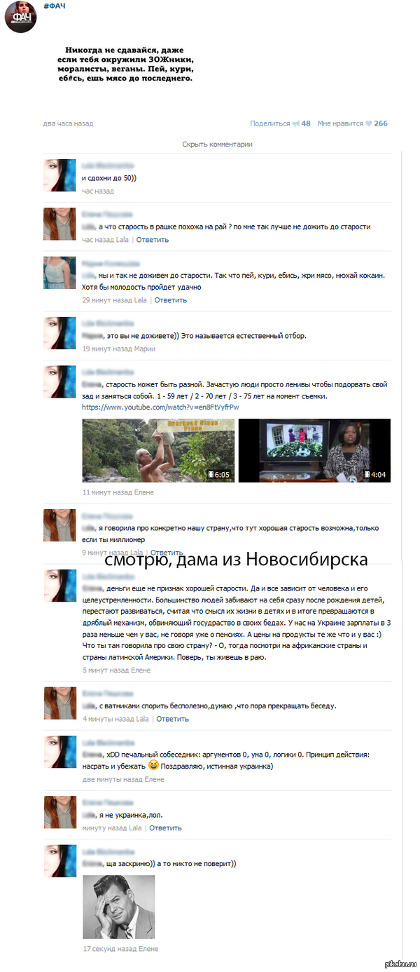 23 LalaBM О старости в России 11 лет назад Состоялся небольшой диалог на тему "ЗОЖ vs деградация". Молодежь выбирает второе. А если ты не согласен, ты ватник. [моё] Старость Россия Украина ВКонтакте Диалог Лень ЗОЖ Ватник