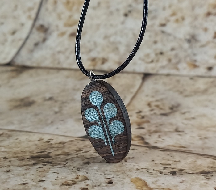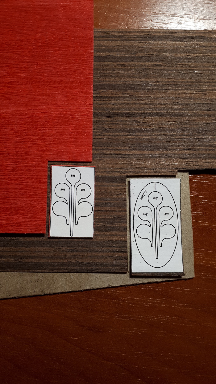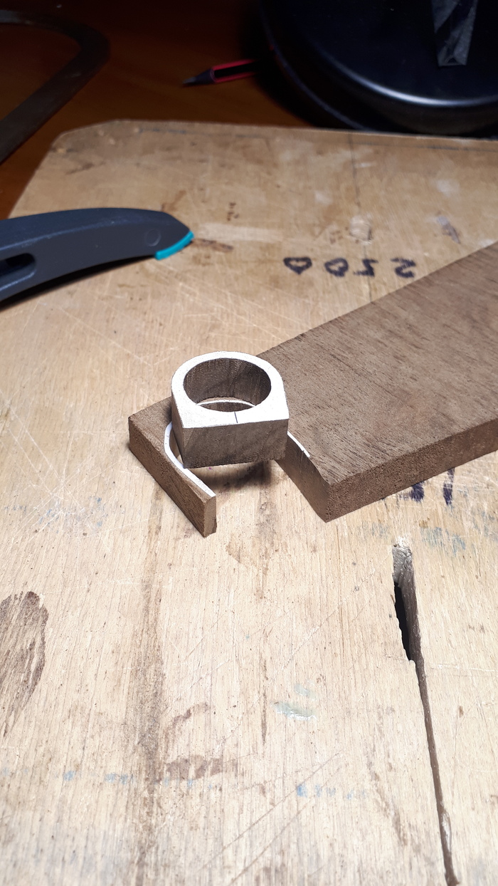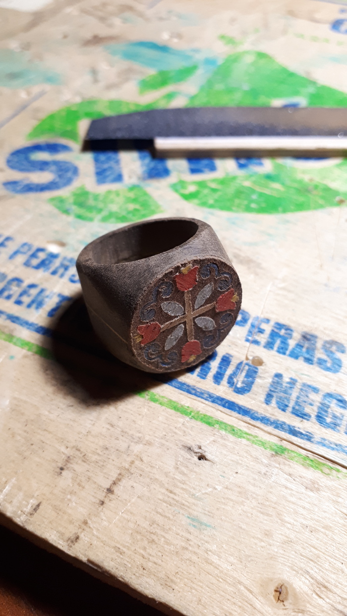 Всем привет, после нескольких колец захотелось разнообразия и дополнительного опыта и поэтому пришла мысль сделать его. Было интересно проверить насколько мелкие детали я смогу вырезать. Сделать его удалось с 5 попытки и после небольших изменений в рисунке. Основной проблемой оказались синие завитушки. Сначала предполагал распилить детали в "пакете", способ распила деталей в маркетри, разом все похожие элементы, но увы от этого метода пришлось отказаться, поэтому каждую деталь вырезал отдельно. Для дополнительной прочности пришлось усиливать шпон и увелить размеры заготовки картоном, для удобного пиления. После сборки рисунка из шпона, склеил две дощечки из ореха и сделал вставку из желтого кото для контраста. Пару раз думал что перстень останется в моей коллекции запоротых работ. Еще было трудно понять получится ли из угловатой заготовки то, что я задумал, поскольку делал такой перстень первый раз.