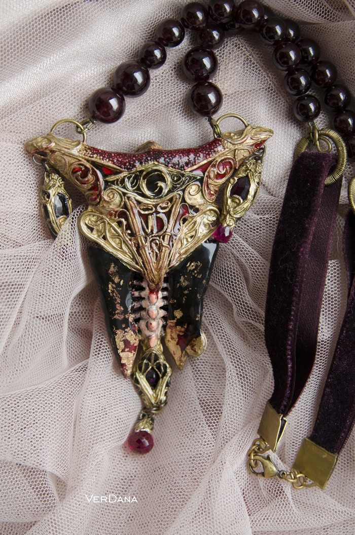 Металлическая фурнитура из латуни. ◽Подвешено на бархатную ленту с бусинами граната.
