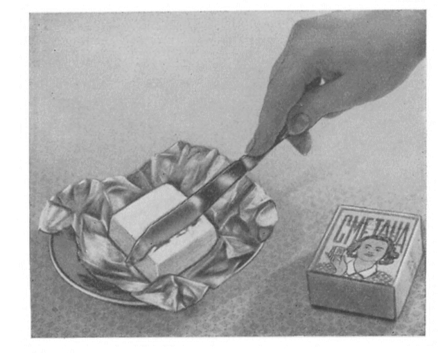 Но существовал еще один вид сметаны, который то появлялся в продаже, то исчезал почти до полной неуловимости - "Любительская" сметана в брикетах, внешне очень похожая на сырковую массу. По цене она мало чем отличалась от других видов (до реформы 1961 года - 2 руб. 60 коп., в 1970-е годы - 28 коп.), но была такой плотной, что ее приходилось резать ножом.