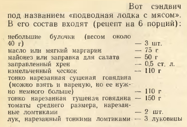 Конвейерное изготовление сэндвичей хоть и учитывало многие технологические нюансы этого процесса, все же сильно отличалось от западных оригиналов. Так, например, особую популярность получил сэндвич с очень странным, отдающим черным юмором, названием «Подводная лодка с мясом». Понятно, что это был вариант знаменитого американского Submarine sandwich, в основе которого использовалась удлиненная булочка, формой напоминающая субмарину.
