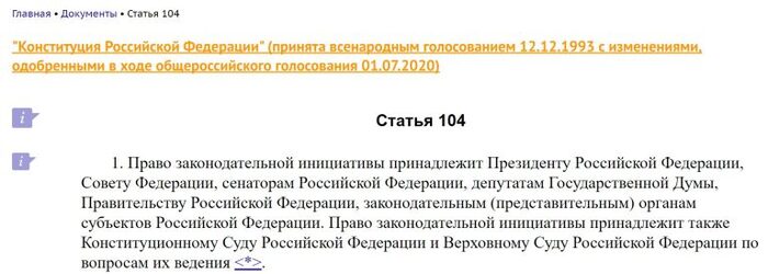 Напомним, согласно Конституции РФ и федеральному законодательству, право вносить законопроекты принадлежит только Президенту, Правительству, сенаторам, депутатам Госдумы, законодательным органам регионов, а также Конституционному и Верховному судам. Любые заявления от других лиц — даже если они занимают общественные должности — не являются законодательными инициативами.